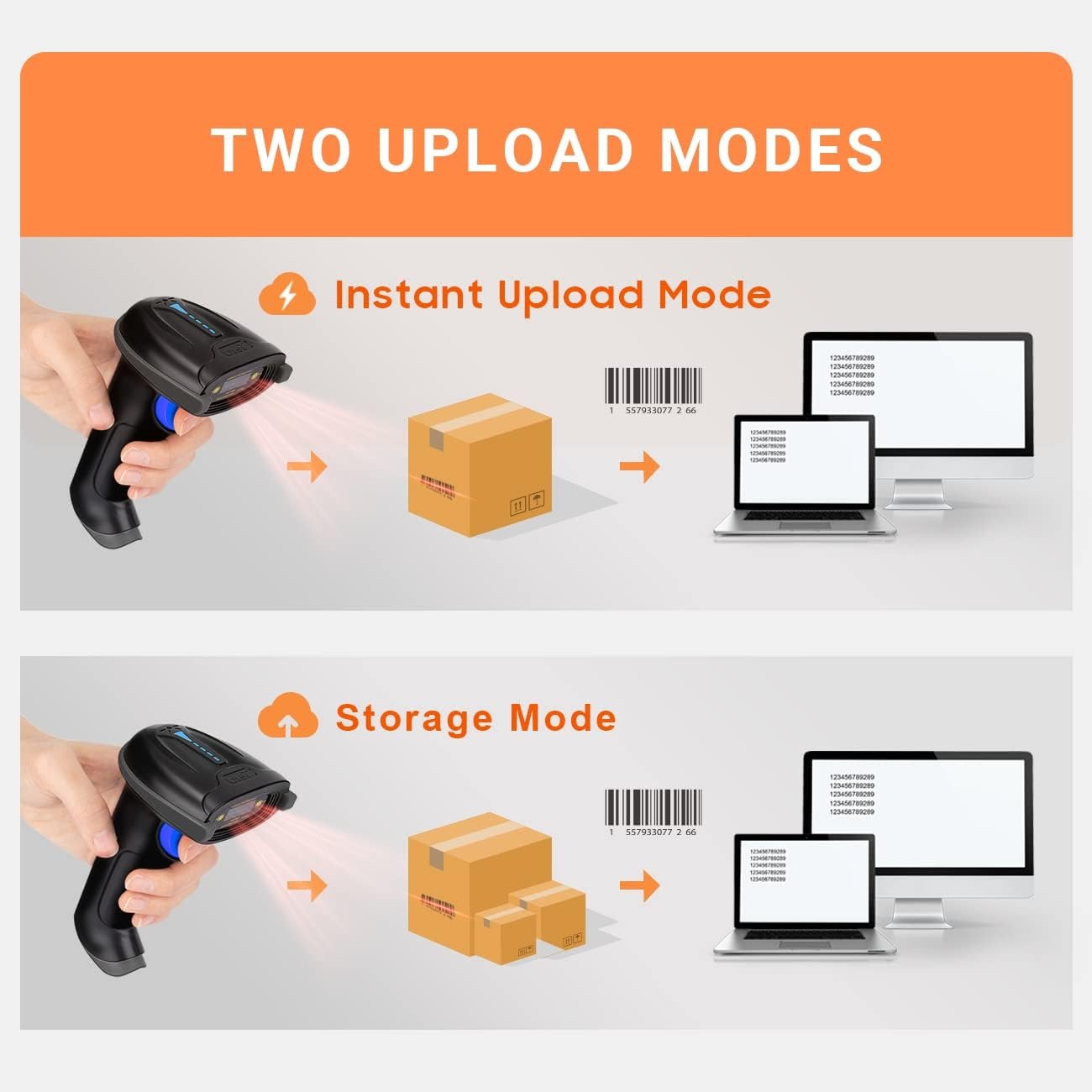 Instant upload mode: Barcode upload directly to your device after scanning. Storage Mode: Scan the bar code and store the data inside the built-in storage of scanner and then upload the data to your device when you need it.